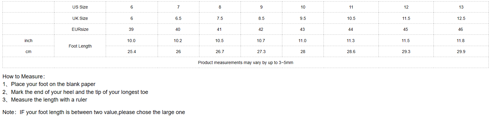 | US Size | 6 | 7 | 8 | 9 | 10 | 11 | 12 | 13 | |