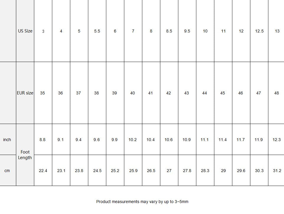 | US Size | 3 | 4 | 5 | 5.5 | 6 | 7 | 8 | 8.5 | 9.5 | 10 | 11 | 12 | 12.5 | 13 | |